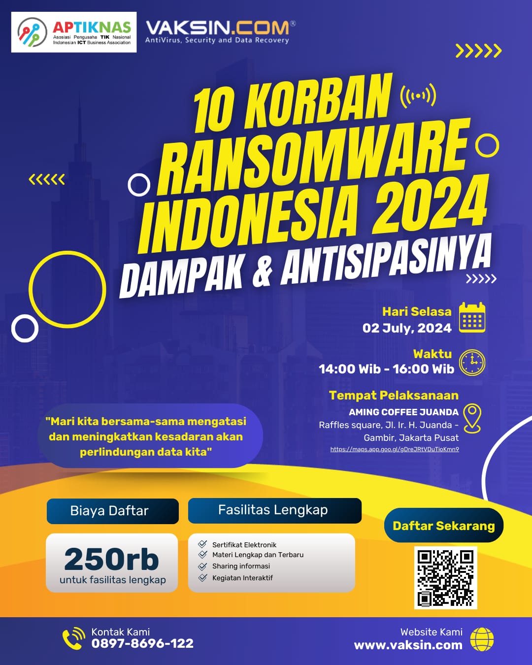 Untuk itulah bersama APTIKNAS (Asosiasi Pengusaha Teknologi Informasi dan Komunikasi Nasional) menyelenggarakan seminar terkait serangan Ransomware dengan pemaparan terkait dampak & antisipasinya.
