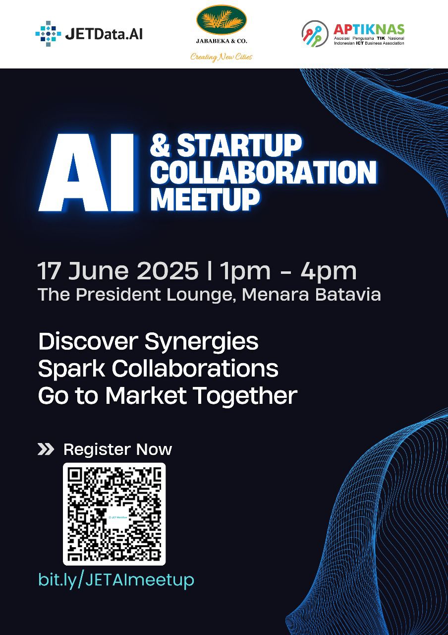 JETData.AI, in partnership with APTIKNAS & Jababeka, is excited to host an AI & Startup Collaboration Meetup!