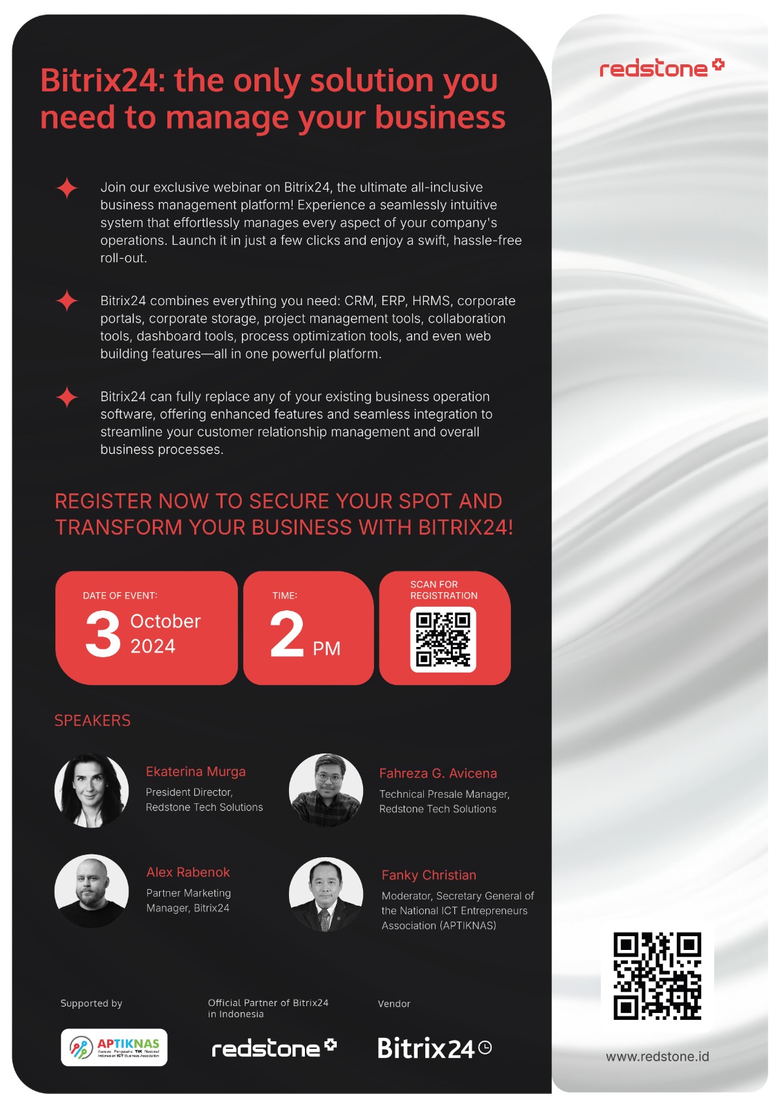 Kami dari Redstone Tech Solutions, mitra resmi Bitrix24 di Indonesia, dengan senang hati mengundang Anda untuk bergabung dalam webinar eksklusif kami tentang Bitrix24, platform manajemen bisnis all-in-one terbaik!