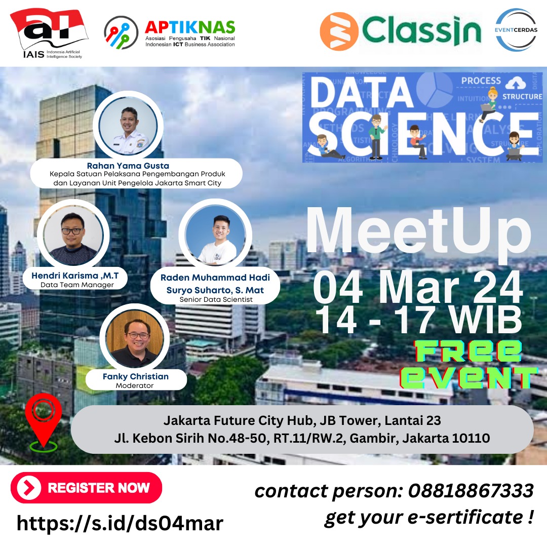 IAIS (Indonesia Artificial Intelligence Society) bersama APTIKNAS (Asosiasi Pengusaha TIK Nasional) mengadakan DATA SCIENCE MEETUP – 4 Maret 2024, di Jakarta Future City Hub – JB Tower Lt.23 Jakarta.