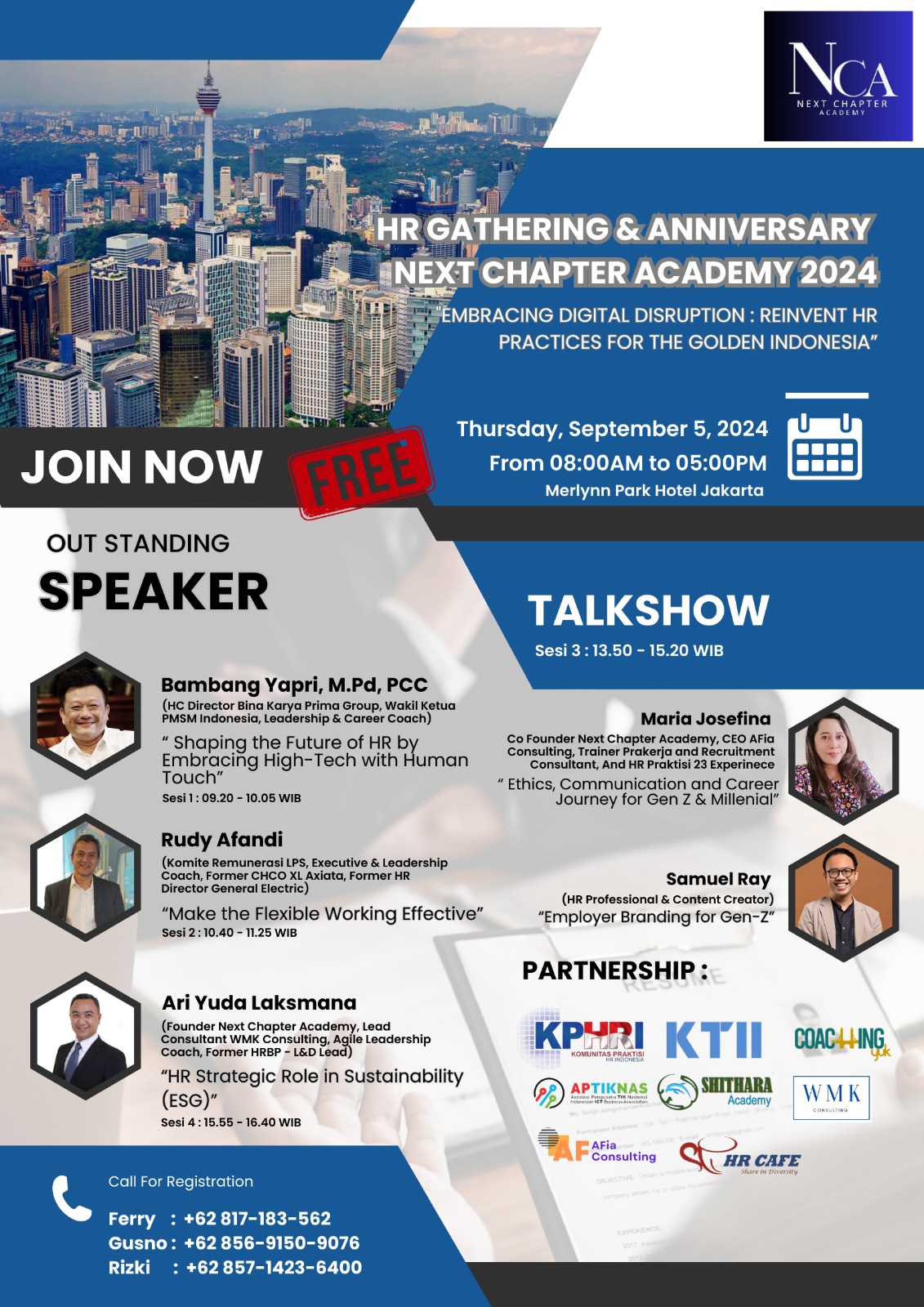 Bersama dengan Next Chapter Academy (NCA) yang berperan sebagai wadah edukasi dan penyedia program pengembangan SDM, dengan misi “Menjadi Komunitas Ekspert yang top of mind di Indonesia melalui kegiatan edukasi dan personal branding”, kami hadirkan ruang berkembang bagi anda melalui event ini.