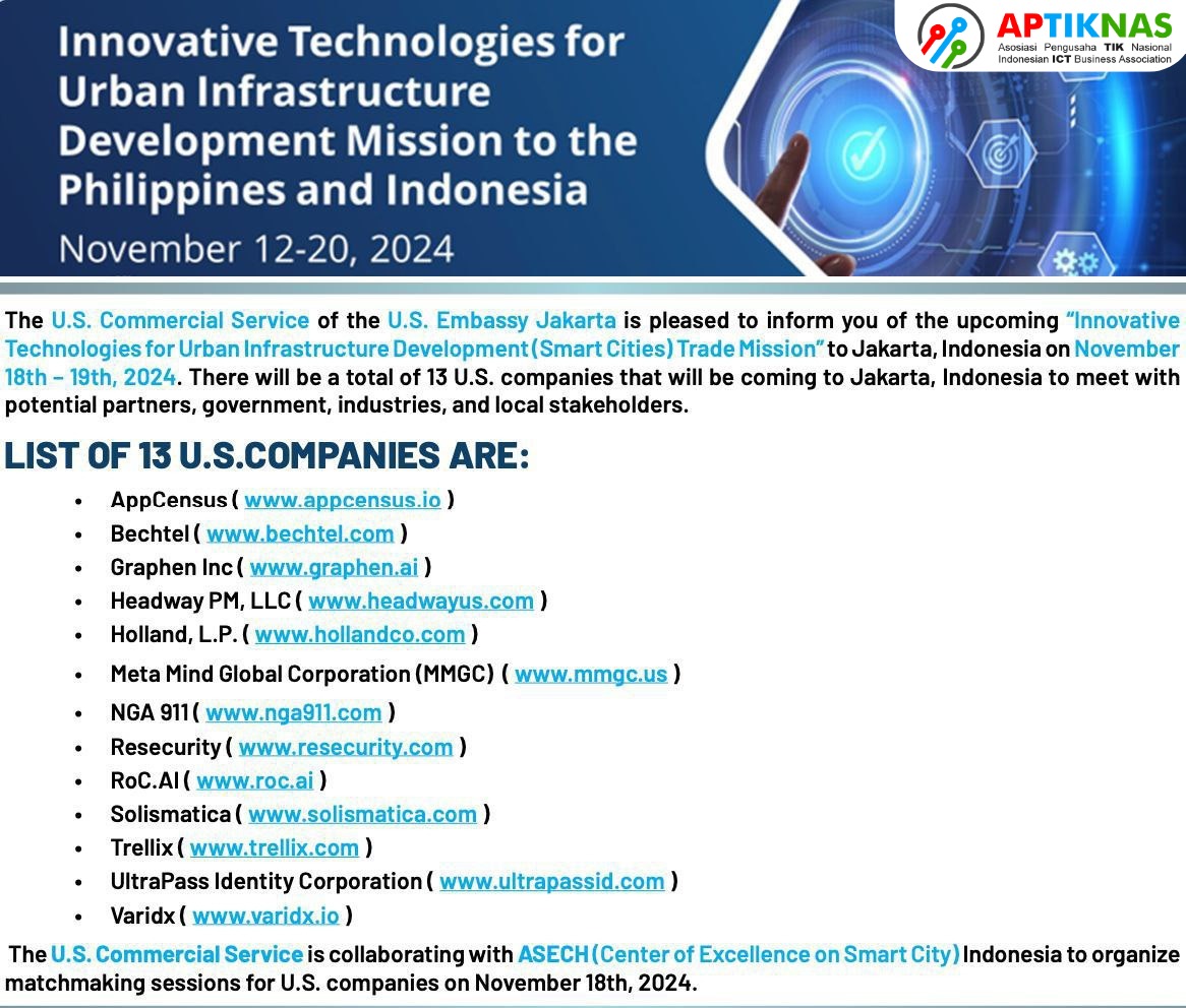 Acara ini merupakan bagian dari misi Innovative Technologies for Urban Infrastructure Development Mission dari Kedutaan Besar Amerika Serikat di Jakarta, yang akan menghadirkan 11 perusahaan AS untuk menjajaki peluang kemitraan di sektor kota pintar di Indonesia. Ini adalah kesempatan bagi para pemain kunci dalam industri ini untuk berinteraksi dan menjalin hubungan bisnis dengan perwakilan dari perusahaan-perusahaan tersebut.