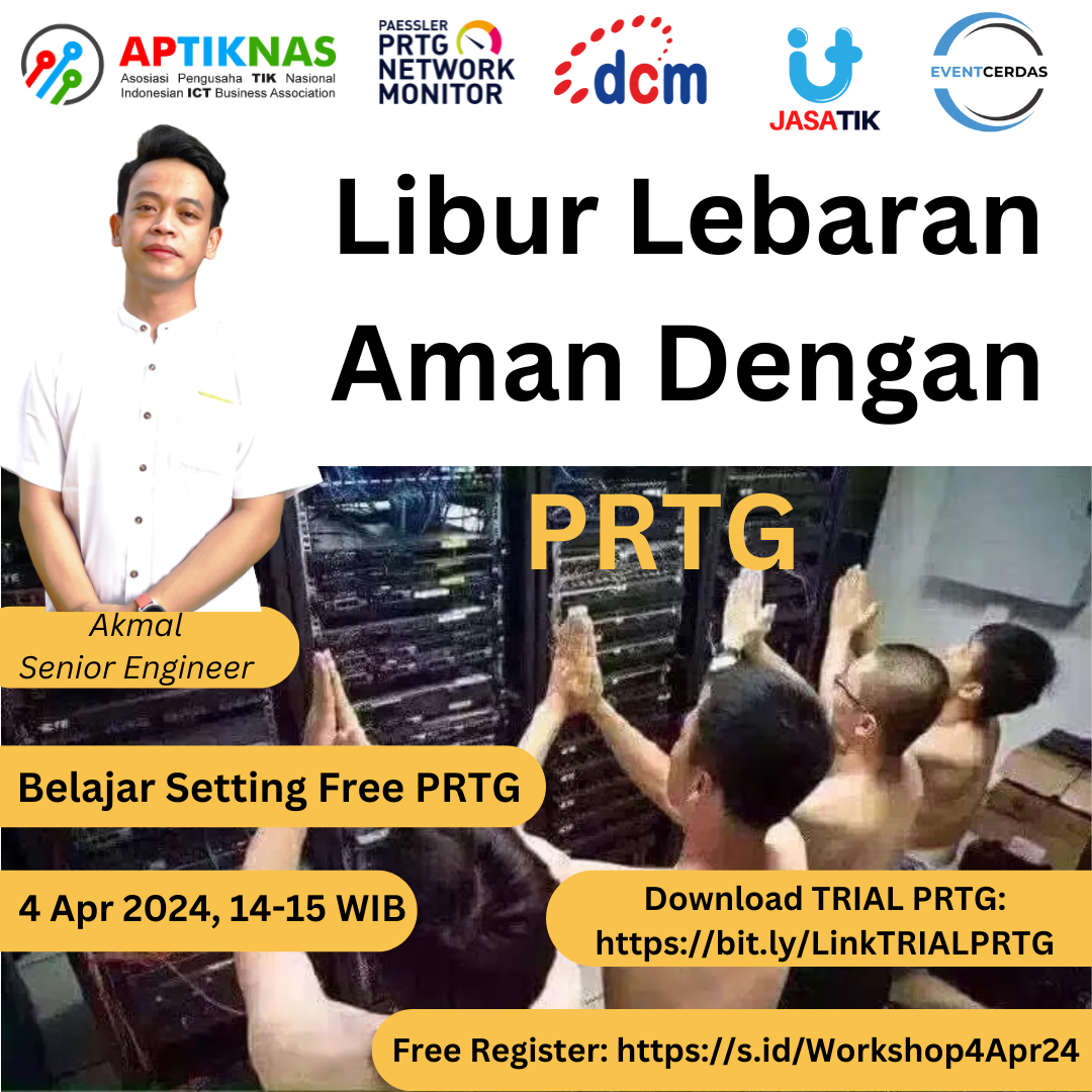 PRTG dapat membantu liburan Lebaran anda jadi aman, karena semua termonitoring dengan baik. Ikuti workshop JASATIK yang akan memandu setting Free PRTG 100 Sensor untuk kebutuhan monitoring selama libur lebaran.