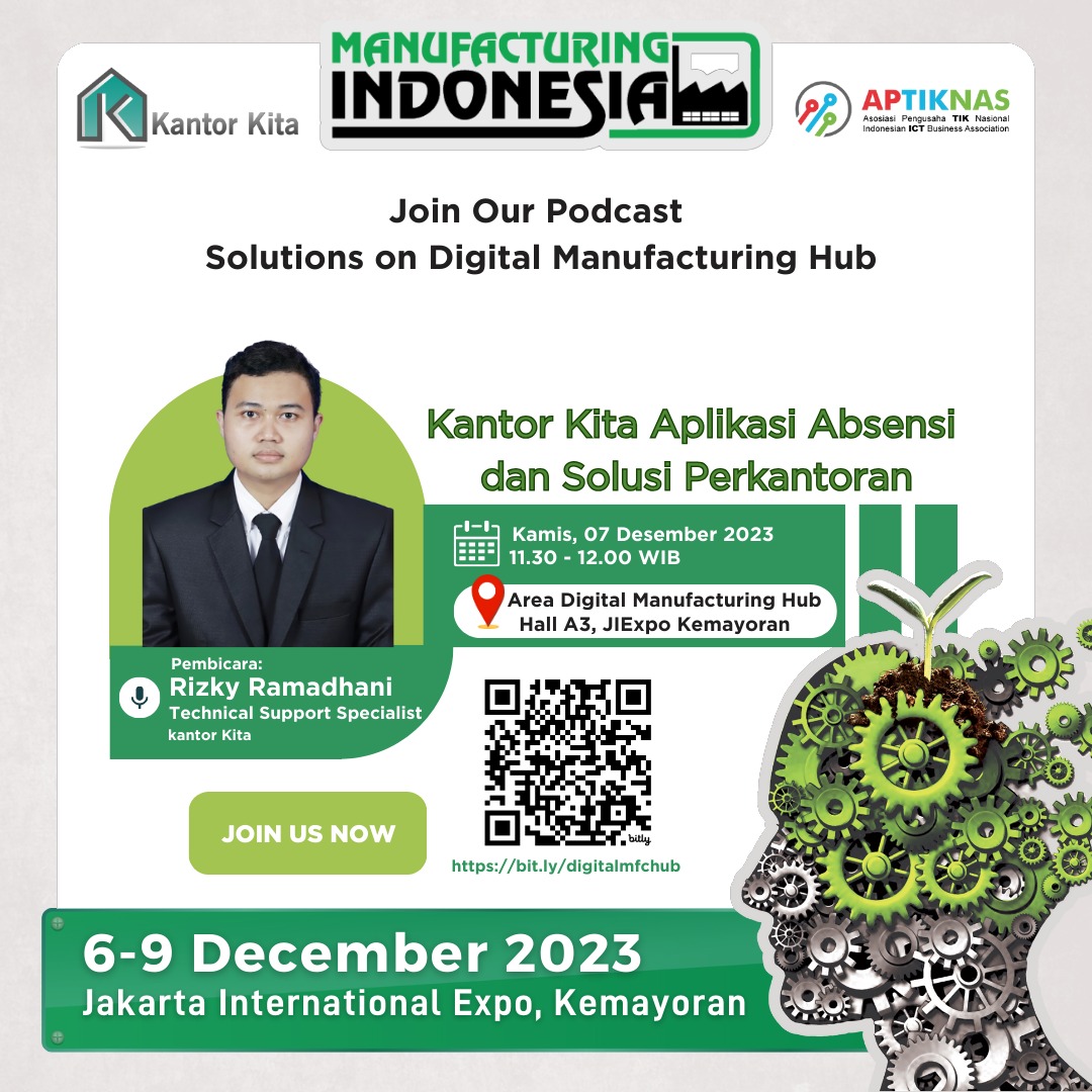 Menyambut pak Rizky Ramadhani yang akan menyampaikan materi “Kantor Kita Aplikasi Absensi dan Solusi Perkantoran” dalam presentasi podcast di Digital Manufacturing Hub, di area Manufacturing Indonesia, JIEXPO Jakarta.