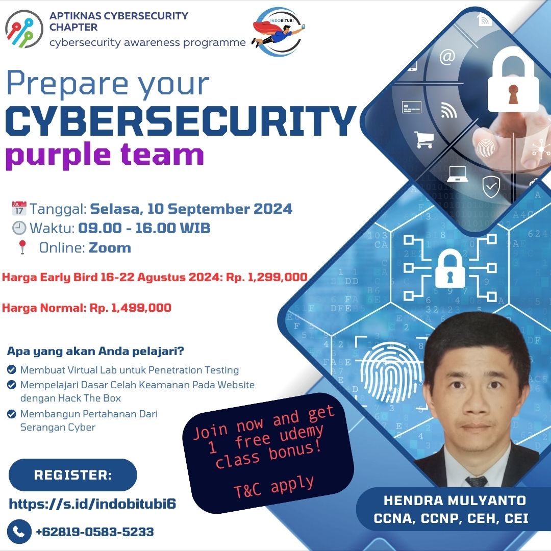 Bergabunglah dalam Kelas Eksklusif Pertama di Indonesia “Prepare Your Cybersecurity Purple Team” bersama Hendra Mulyanto, pakar keamanan siber. Dalam kelas intensif ini pelajari strategi, teknik, serta best practices terbaru untuk melindungi sistem IT Anda dari serangan siber.